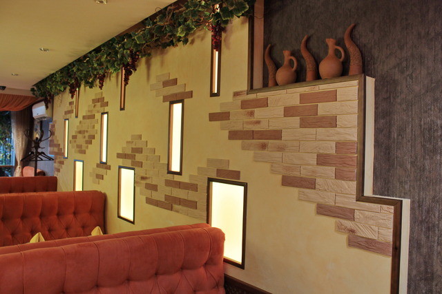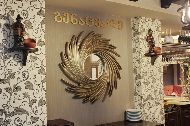 Кафе «Генацвале» оформлено в современном стиле. Кафе удобно зонировано, для каждого гостя найдется уютное местечко для теплых бесед. Национальный колорит заведению придают стеллажи с глиняными кувшинами и домашними заготовками, ковры на стенах и необычная прихожая, оформленная как улочка со скамьями. В «Генацвале» вы словно попадаете в маленькую современную Грузию.